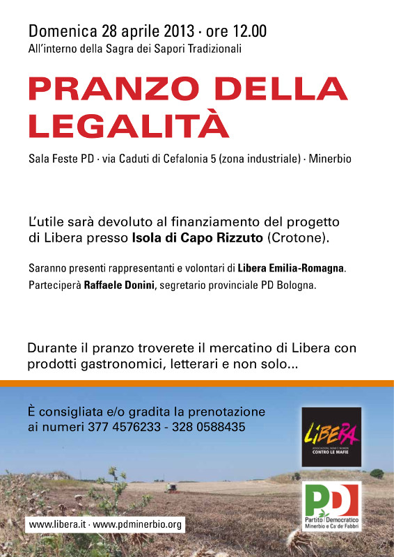 Domenica 28 aprile pranzo a favore di Libera, per un’Italia senza mafie.